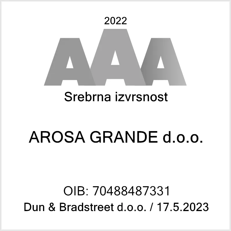 Tento certifikát bonity excelentnosti preukazuje zákazníkom a obchodným partnerom bezpečnosť, stabilitu, kvalitu a spoľahlivosť pri obchodovaní so spoločnosťou Arosa Grande d.o.o.